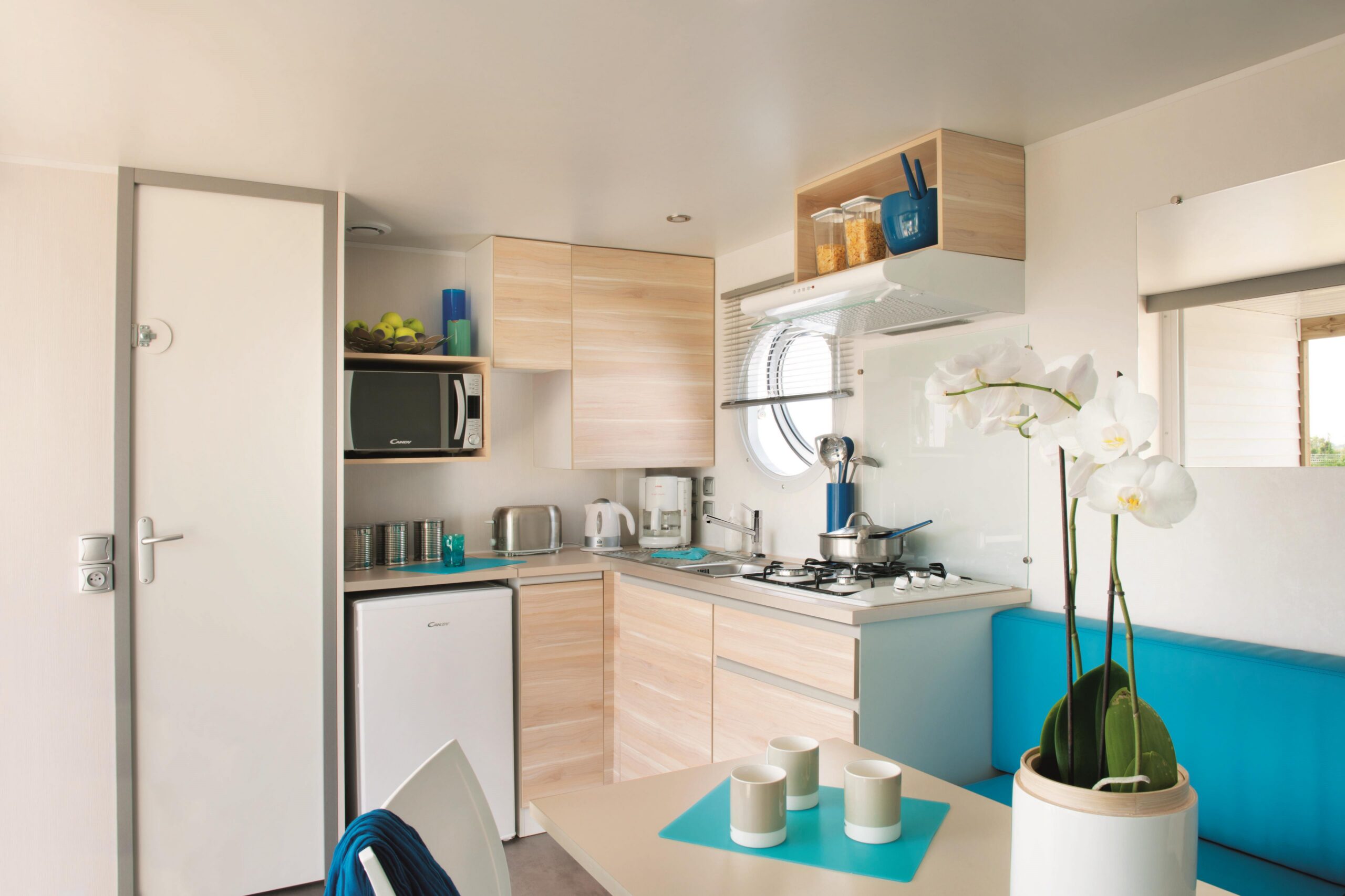 Mobil-home 28 m² 2 chambres – 4/6 personnes. 1chambre avec lit de 140 et sa salle d’eau privative avec wc, 1 chambre avec 2 lits de 80 et sa salle d’eau privative avec wc, ainsi qu’un couchage d’appoint dans le salon (130). Une cuisine avec plaque de cuisson 4 feux, réfrigérateur, cafetière électrique, micro-ondes, vaisselle. Terrasse couverte avec salon de jardin et chiliennes.